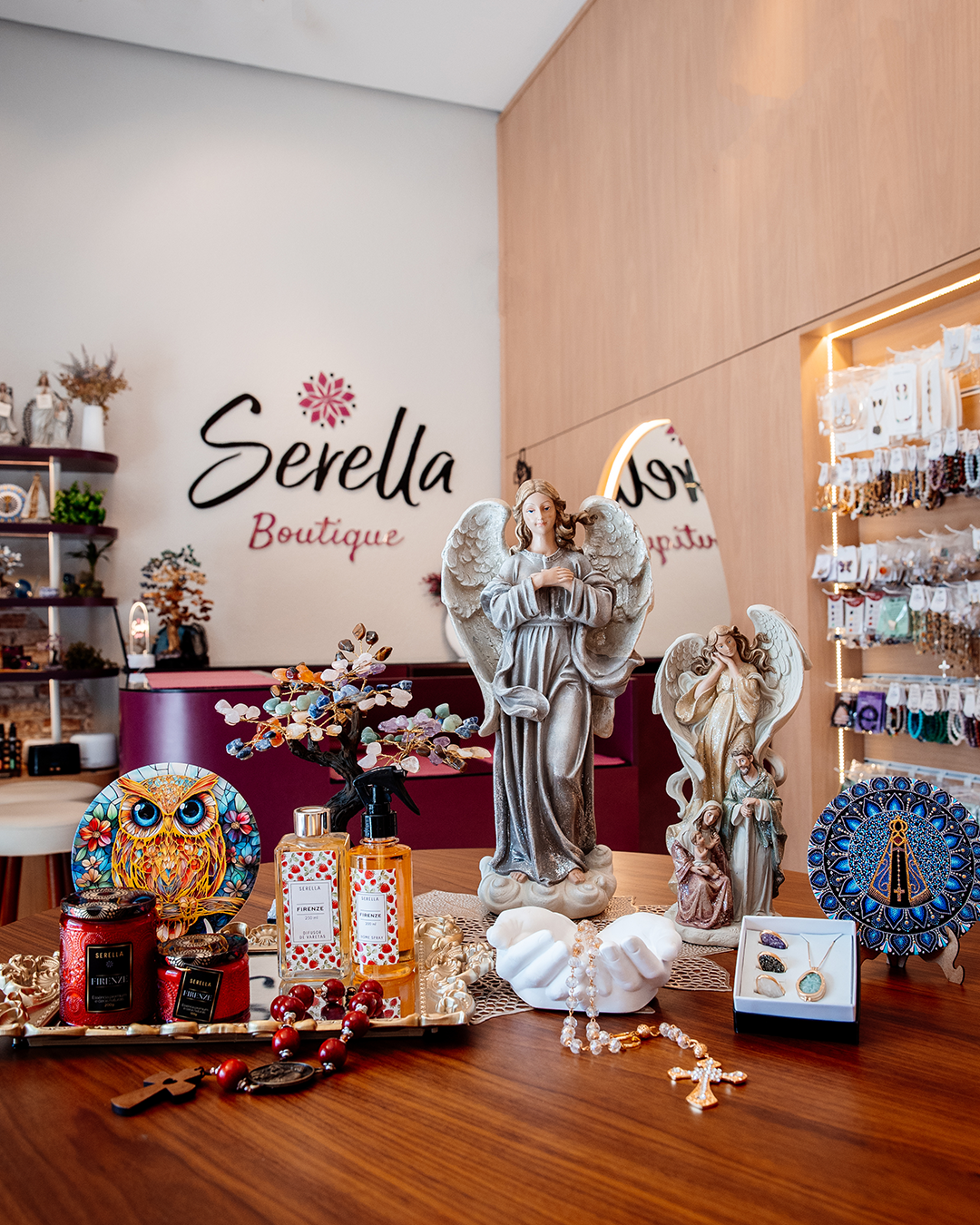 O QUE FAZ? "Trabalhamos com presentes que encantam a alma: velas e aromas que acolhem, cristais que energizam, o místico e o religioso que se complementam e peças de decoração cheias de propósito."