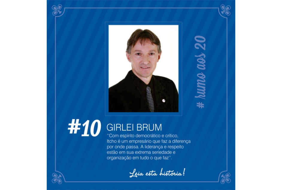 O Itcho é daqueles empresários que, dentro de nossa entidade, sempre colocou Garibaldi em primeiro lugar, a “cidade”. Com este espírito democrático, mas bastante crítico, Itcho é um empresário que faz a diferença por onde passa. A liderança e respeito estão em sua extrema seriedade e organização em tudo o que faz. Obrigado por tudo!