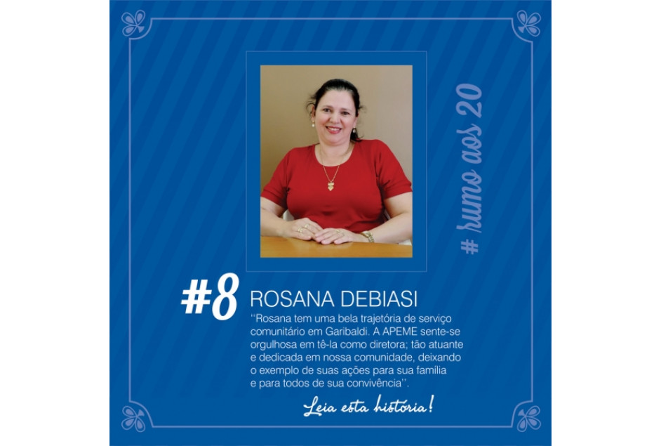 Por tudo isso, a APEME sente-se orgulhosa em ter uma voluntária como Rosana em sua diretoria, tão atuante e dedicada em nossa comunidade, deixando o exemplo de suas ações para sua família e para todos de sua convivência.