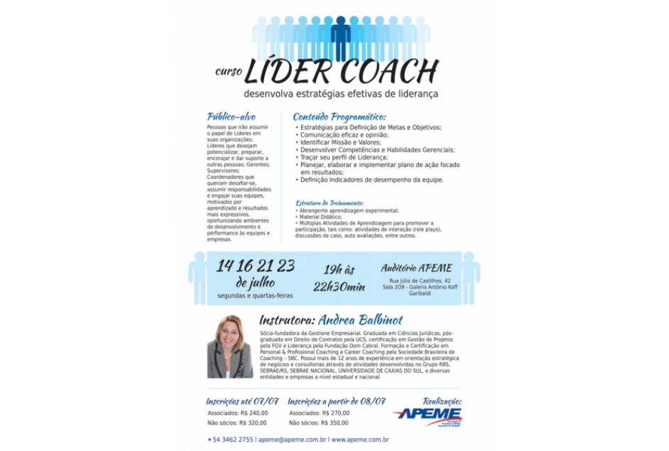 A APEME – Associação de Pequenas e Médias Empresas de Garibaldi, dando sequência ao calendário de cursos e capacitações de 2014, abre inscrições para o treinamento “Líder Coach: Desenvolva estratégias efetivas de liderança”. O mesmo será nos dias 14, 16, 21 e 23 de julho, segundas e quartas-feiras, das 19h às 22h30min. O curso será no Auditório da APEME, localizado na Rua Júlio de Castilhos, 42/209, em Garibaldi. A carga horária é de 16 horas/aula.