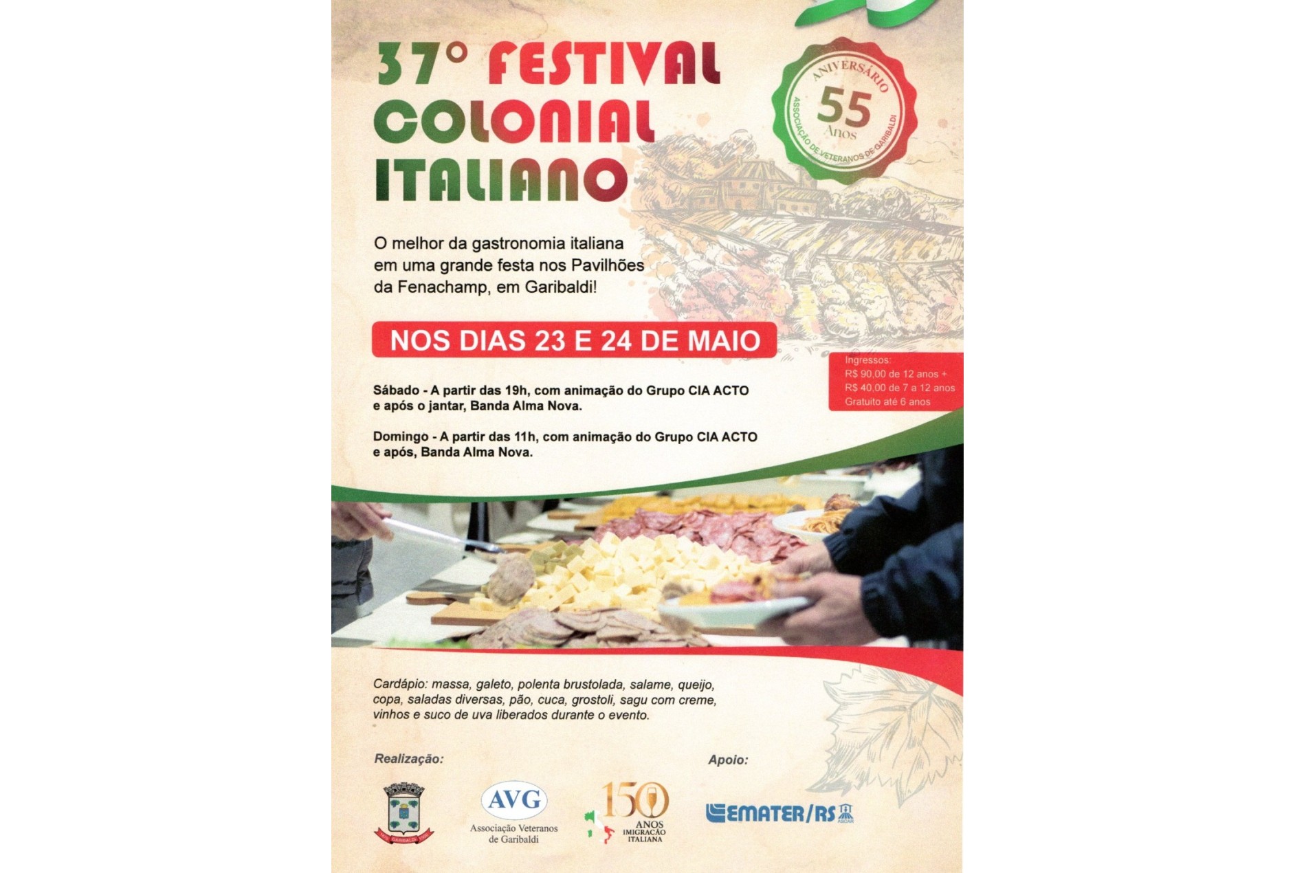 Cardápio: massa, galeto, polenta brustolada, salame, queijo, copa, saladas diversas, pão, cuca, grostoli e sagu com creme. Vinhos e suco de uva liberados durante o evento.