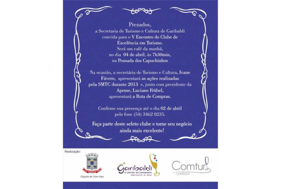 A Secretaria de Turismo e Cultura de Garibaldi promove o V encontro do Clube de Excelência em Turismo. Será no dia 4 de abril, às 7h30min. O café da manhã acontece na Pousada dos Capuchinhos e terá um custo de R$10,00 por pessoa. A ocasião pretende reunir o setor turístico de Garibaldi e fazer um balanço das atividades que já foram realizadas.