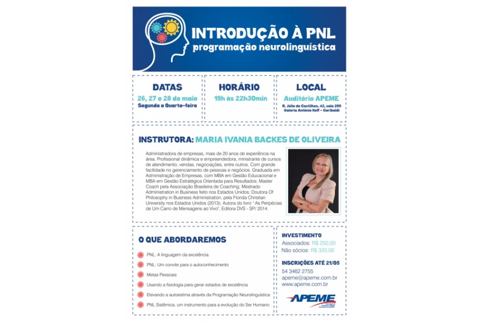 A APEME – Associação de Pequenas e Médias Empresas de Garibaldi, está com inscrições abertas para o Curso “Introdução à PNL – Programação Neurolinguística”. O mesmo acontecerá nos dias 26, 27 e 28 de maio, segunda a quarta-feira, no horário das 19h às 22h30min. O curso acontecerá no Auditório da APEME, localizado na Rua Júlio de Castilhos, 42/sala 209 – Galeria Antonio Koff.