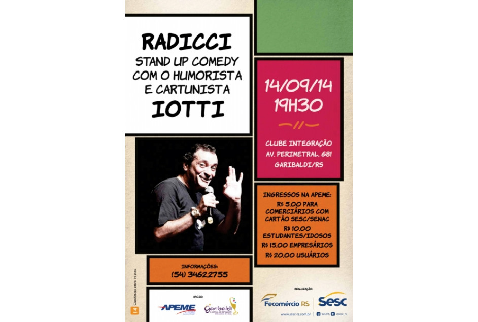 O Arte Sesc – Cultura por toda parte promove a apresentação do stand up comedy do humorista e cartunista Iotti, em Garibaldi. A apresentação será realizada no dia 14 de setembro, domingo, às 19h30min, no Clube Integração. A atividade é uma realização do Sistema Fecomércio-RS/Sesc, com apoio da Associação das Pequenas e Médias Empresas de Garibaldi (APEME) e Prefeitura Municipal de Garibaldi, através da Secretaria de Turismo e Cultura.
