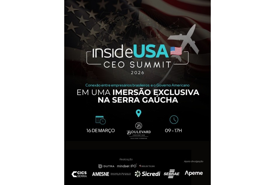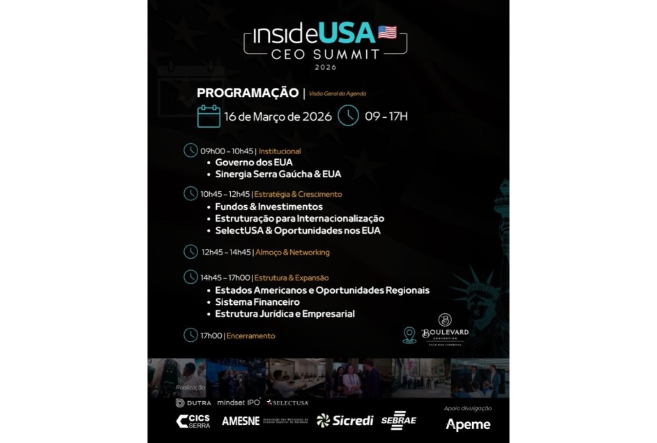O encontro acontece no dia 16 de março, das 9h às 17h, no Plaza Hotel & Boulevard Convention (Avenida Garibaldina, 1441 - Garibaldina, Garibaldi/ RS). A participação gratuita, mediante inscrição e aprovação prévia, que pode ser feita pelo site https://www.sympla.com.br/evento/inside-usa-ceo-summit-2026/3321107?token=787ff60b1e11f3302c45bb9b47f69cd5.