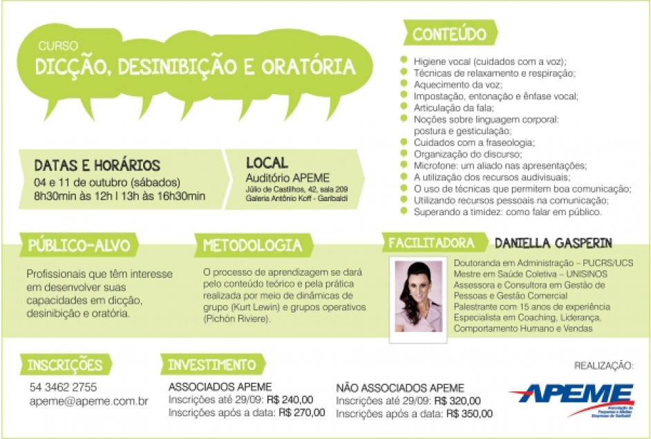 A APEME – Associação de Pequenas e Médias Empresas de Garibaldi irá promover o curso de “Dicção, Desinibição e Oratória”, com a facilitadora Daniella Gasperin. Daniella já ministrou diversos cursos na entidade, sendo muito bem avaliada pelos participantes. Ela é doutoranda em administração pela PUCRS/UCS; mestre em saúde coletiva pela Unisinos; assessora e consultora em gestão de pessoas e gestão comercial; palestrante com quinze anos de experiência, especialista em Coaching, Liderança, comportamento humano e vendas.