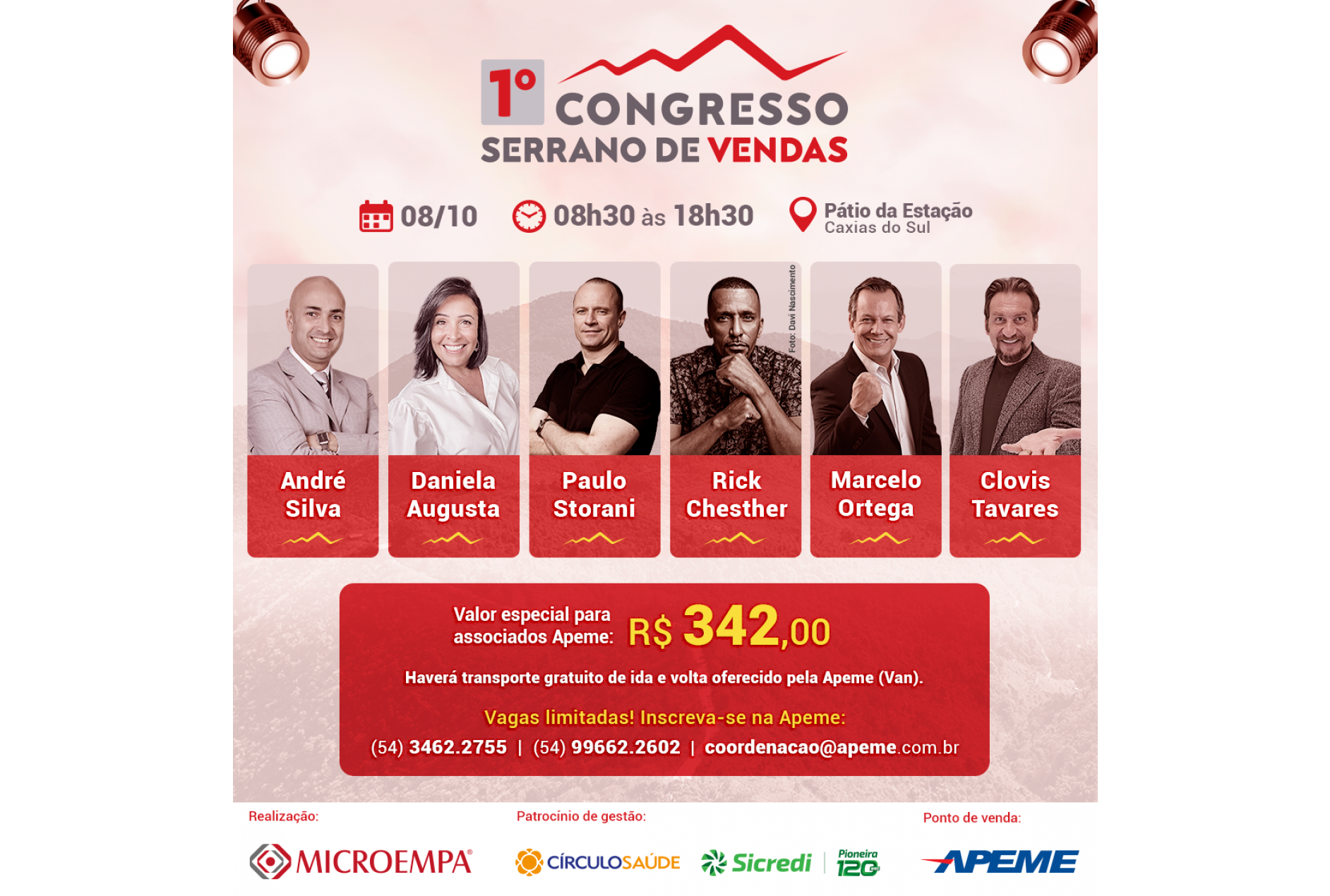 Associados Eventos GeralA Associação de Pequenas e Médias Empresas (Apeme) de Garibaldi, em parceria com a Associação das Empresas de Pequeno Porte da Região Nordeste do RS (Microempa), oferecerá valores diferenciados de ingressos e transporte gratuito para associados interessados em participar do 1º Congresso Serrano de Vendas. O evento, que acontece no dia 08/10, levará a Caxias do Sul os palestrantes André Silva, Daniela Augusto, Paulo Storani, Rick Chesther, Marcelo Ortega e Clóvis Tavares, considerados nomes gigantes no setor comercial.