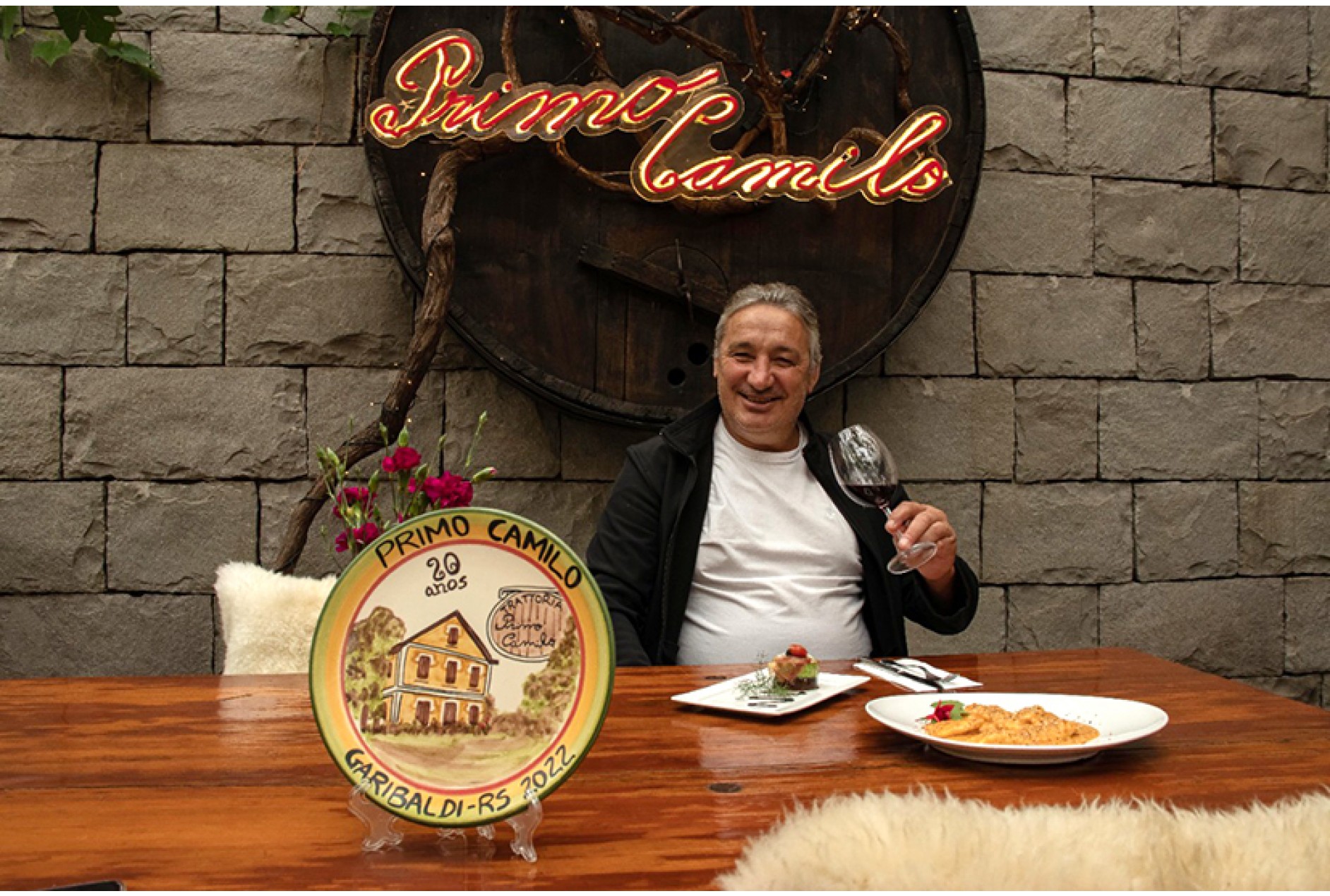“Primo Camilo Pessali era o meu avô, uma pessoa que adorava ver a mesa rodeada de pessoas e de alegria. E onde tem alegria, tem comida e vinho. Eu era atleta profissional de futebol e também tinha experiência como garçom. Uns dez anos antes de eu me aposentar como atleta já vínhamos falando desse sonho de abrir um restaurante. Após uma temporada no Japão, voltei a Garibaldi e meu cunhado havia comprado a casa onde hoje fica a trattoria. Esse foi o começo de tudo. Ele alugou a casa para que eu e a Clege abríssemos o Primo Camilo e estamos aí há 20 anos elaborando cardápios e fazendo experiências – nenhuma catastrófica [risos]”, conta Pessali.