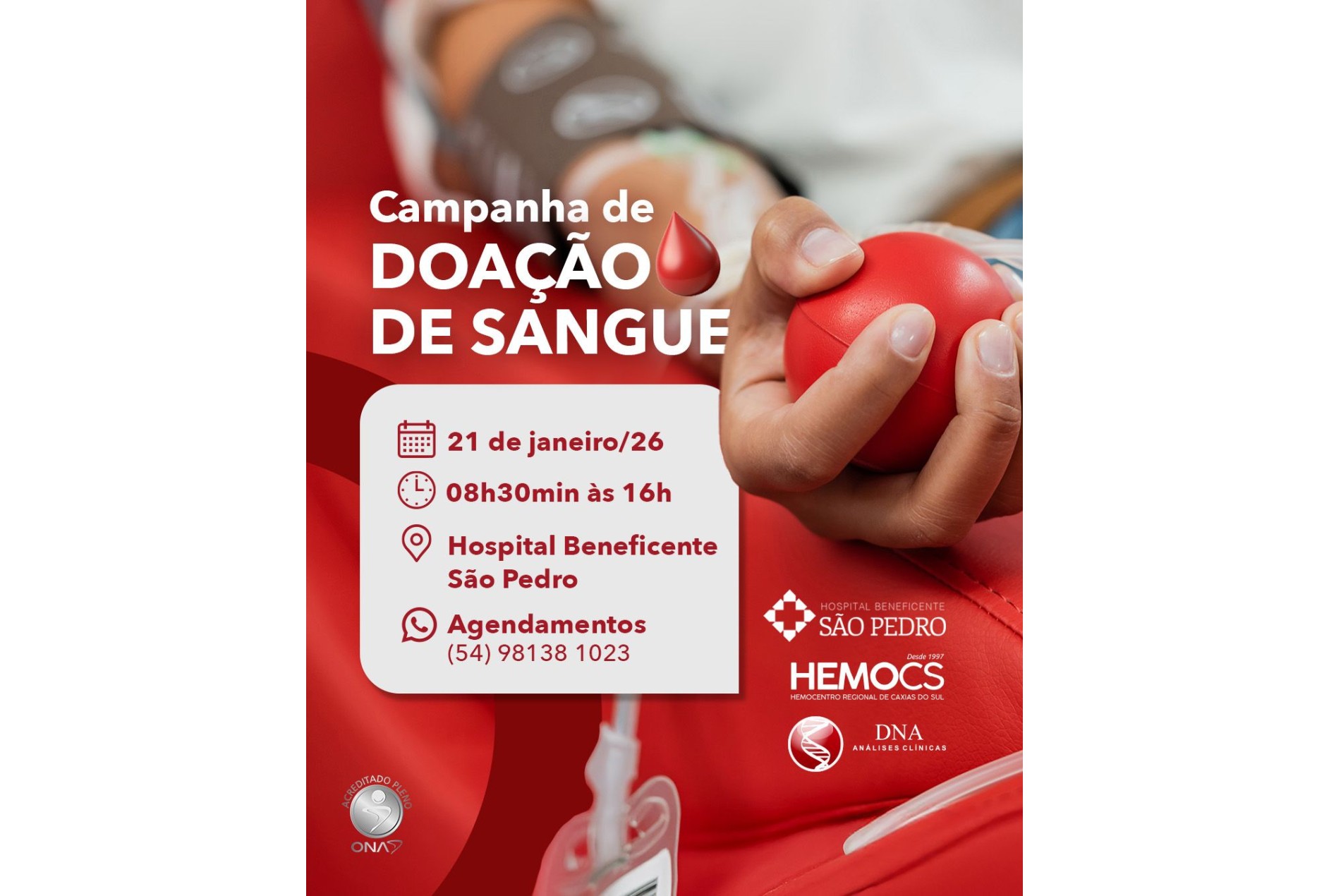 Geral Parceiros Voluntários SolidariedadeO Hospital Beneficente São Pedro de Garibaldi realiza, em parceria com o HEMOCS e o Laboratório DNA, uma Campanha de Doação de Sangue. A ação acontece no dia 21 de janeiro, das 8h30 às 11h e das 13h30 às 16h, no Bloco B do hospital.